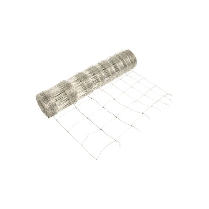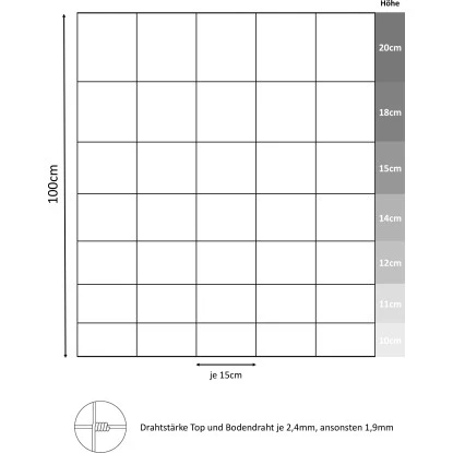 Das Knotengeflecht ist aus verzinktem Stahl und hat eine Höhe von 1 m, eine Länge von 50 m und eine Maschenweite von 8 cm x 5,5 cm. Das Geflecht kann z. B. als Weidezaun eingesetzt werden.