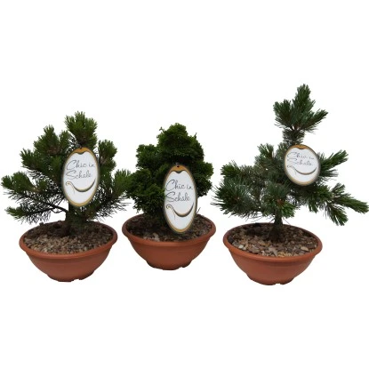 Bei den Edelgehölzen „Chic in Schale“ handelt es sich um schwachwachsende, winterharte Gehölze. Diese in dekorativen Schalen gepflanzten Koniferen eignen sich hervorragend für die Gestaltung der Terrasse oder des Balkons.