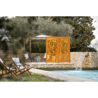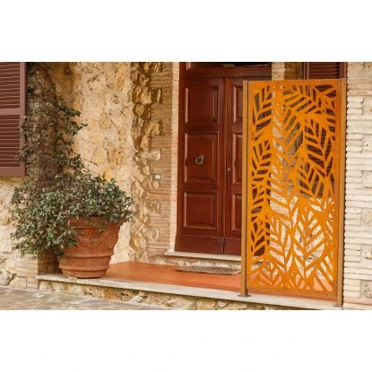 Mit natürlichem Charme: Der Eleo Sichtschutz Livenza aus wetterfestem Cortenstahl verfügt über ein aufwendiges Muster in Form von Buchenblättern. Livenza ist von Hand aus hochwertigem Metall geschmiedet. Die witterungsbeständige Sichtschutzwand fügt sich harmonisch in Ihre Gartengestaltung. Das detailreiche Blattmuster schützt vor neugierigen Blicken.
