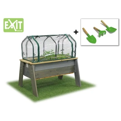 Mit dem EXIT Aksent Hochbeet L mit Gewächshaus und Gartengeräten lernen Kinder spielend mit der Natur umzugehen. Sucht zusammen die Pflänzchen aus, die in die Erde eingepflanzt werden können, denn Kinder können mit den Hochbeeten von EXIT Toys selbst für ihre Pflänzchen sorgen. Das EXIT Aksent Hochbeet L steht auf Beinen, sodass du stehend und mit mehreren Kindern zugleich gärtnern kannst. Das Gewächshaus sorgt dafür dass du bei Wind und Wetter Pflänzchen ziehen kannst. Auch gegen Wind, leichten Frost und Ungeziefer werden die Pflänzchen optimal geschützt.Die Aksent Hochbeete von EXIT Toys wirden aus FSC-zertifizierter Kiefernholz (FSC 100%, FSC® SCS-COC-007799) hergestellt. Dieses Holz kommt aus Skandinavien und ist von hoher Qualität. Das EXIT Kiefernholz wird unter hohem Druck imprägniert. Dies gewährleistet eine möglichst lange Lebensdauer und das Holz braucht keine weitere Behandlung.