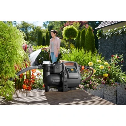 Der Gardena Haus- & Gartenautomat 3500/4 kann für die Wasserversorgung im Haus, für beispielsweise die Toilettenspülung und die Waschmaschine eingesetzt werden. Aber auch die Verwendung als Gartenpumpe ist möglich. Durch das wetterfeste Gehäuse kann die Pumpe unbeschadet die ganze Freiluftsaison über draußen stehen. Die integrierte Elektronik aktiviert den Haus- & Gartenautomaten vollautomatisch bei Wasserbedarf und schaltet ihn danach wieder aus. Er ist mit einer Jetpumpe ausgestattet, die das Wasser geräuscharm fördert. Durch die Rückschlagventil-Technik ist ein schnelles Ansaugen garantiert. Der optimierte Ansaugprozess sorgt dafür, dass Wasser in wenigen Sekunden aus bis zu sieben Meter Tiefe gepumpt werden kann. Das Kleinmengenproramm sichert auch bei geringen Fördermengen eine problemlose Anwendung. Integrierte Trockenlaufsicherung. Der Haus- & Gartenautomat verfügt über ein Fehlerdiagnosesystem. Kleinste Störungen, beispielsweise ausgelöst durch tropfende Wasserhähne oder saugseitige Probleme, werden über verschiedene Blinkfrequenzen per LED Blinklicht angezeigt. Ein Tragegriff am Gerät ermöglicht einen leichten Transport.