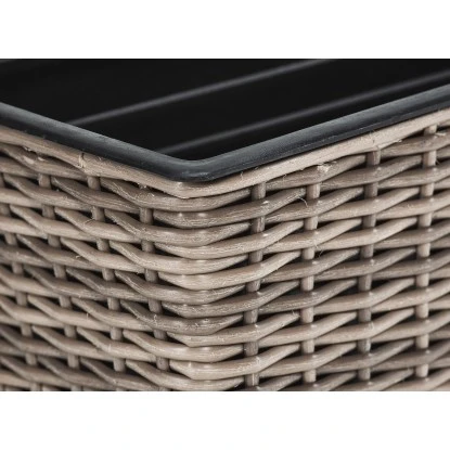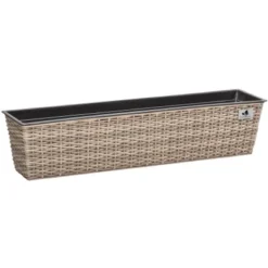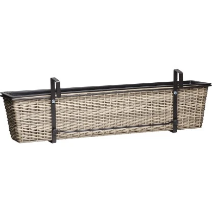 Der Balkonkasten Polyrattan setzt dekorative Akzente auf Ihrem Balkon. Der Balkonkasten ist aus einem hochwertigen PE-Kunststoffgeflecht hergestellt, das über einen Metallrahmen gewebt ist. Die Faser ist UV- und temperaturbeständig, langlebig und pflegeleicht. Durch den integrierten Wasserspeicher brauchen Sie seltener zu gießen, das Bewässerungssytem bietet eine optimale Versorgung und Gießkontrolle durch einen Wasserstandsanzeiger. Der Balkonkasten ist mit Überläufen im Boden ausgestattet um einen Wasserstau zu vermeiden, die bei Aufstellung im Haus (z.B. im Wintergarten) einfach mit beigefügten Kunststoffschrauben verschlossen werden können. Die Balkonkasten-Halterung ist einfach und schnell zu montieren. Die Aufnahmeöffnung der Haken ist für bis zu 5,8 cm breite Balkonbrüstungen bzw. Geländer geeignet, darüber hinaus können auch passende handelsübliche Aufhängungen (separat im Handel erhältlich) verwendet werden.