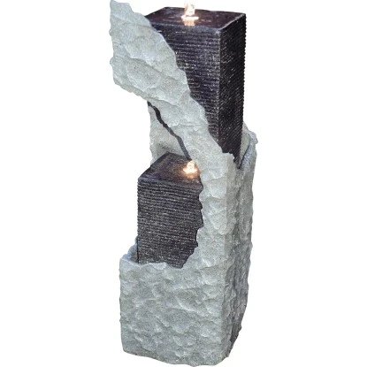 Die Granimex Lizu-4-Eck-Säule Naturstein Design ist die Nachbildung einer naturbehauemnen Granitsäule, Unterbrochen von zwei integrierten Stufensäulen. Aus jeder Stufensäule entspringt Wasser und läuft in Wellen die Säule herunter.