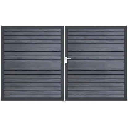 Alle Bestandteile des Tors, einschließlich der BPC-Profile und des Aluminium-Rahmens DB703, bestehen aus hochwertigen Materialien, die Wind und Wetter trotzen und garantiert rostfrei sind. Das Beschlagset ist im Lieferumfang enthalten, während die Pfosten separat erworben werden müssen.