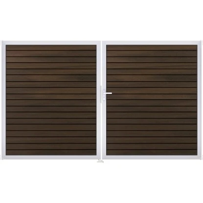 Alle Bestandteile des Tors, einschließlich der BPC-Profile und des Aluminium-Rahmens EV1, bestehen aus hochwertigen Materialien, die Wind und Wetter trotzen und garantiert rostfrei sind. Das Beschlagset ist im Lieferumfang enthalten, während die Pfosten separat erworben werden müssen.