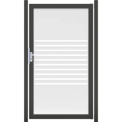 Dieses Tor mit einem Flügel aus Glas mit einem Rahmen aus hochwertigem Aluminium bietet langfristig witterungsbeständigen Schutz. Sämtliches Zubehör, wie Torbänder, Schließblech, Schloss und Griff sind im Lieferumfang enthalten und aus rostfreiem Material gefertigt.
