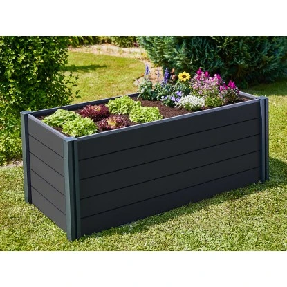 Vor allem durch die hochwertigen Materialien besticht das Hochbeet. Es besteht aus WPC und besitzt stabile Pfosten aus pulverbeschichtetem Aluminium. Diese sehen nicht nur schick aus, sie sind auch witterungsbeständig und langlebig. Außerdem können Sie bei dem Hochbeet die Größe und Form anpassen und benötigen keine zusätzliche Folie als Feuchtigkeitsschutz.