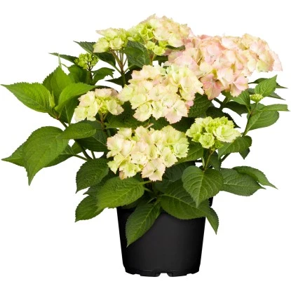 Die Bauernhortensie „Chameleon“ (Hydrangea macrophylla) ist ein Schönheit. Unermüdlich blüht sie den ganzen Sommer über und wechselt ihre Blütenfarbe. Zunächst erscheinen die Knospen in einem zarten Grün, erblühen in Creme, wandeln sich schließlich in ein Pastellrosa um dann einen dunkelrosa bis grünen Farbton anzunehmen.