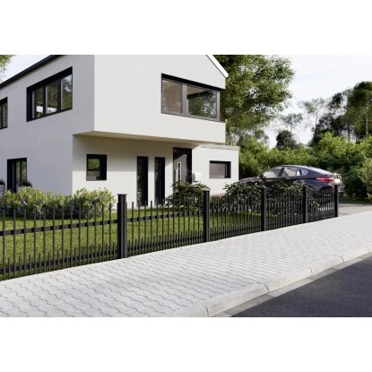 Der Osmo Alu-Fence Square Niedrigzaun in der Farbe Anthrazit fügt sich durch sein minimalistisches Design dezent ins Gesamtbild von Haus und Garten ein und grenzt den privaten Bereich deutlich ab.