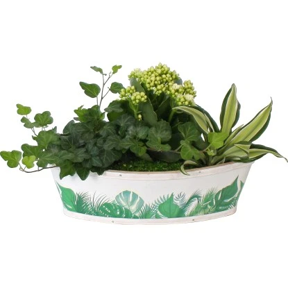 Die Farben Grün und Weiß stehen im Vordergrund dieses imposanten Arrangements sowohl bei den Pflanzenfarben, als auch bei dem Bambus-Gefäß in Bootform. Die Grün- und Blühpflanzen sind herrliche Begleiter im Alltag, mit denen das Wohnumfeld im Handumdrehen einen neuen Look erhält. Die Pflanzen bevorzugen Zimmertemperatur und einen hellen Standort. Bei regelmäßiger Wassergabe machen sie lange Freude. Während der Blüte einmal pro Monat düngen.