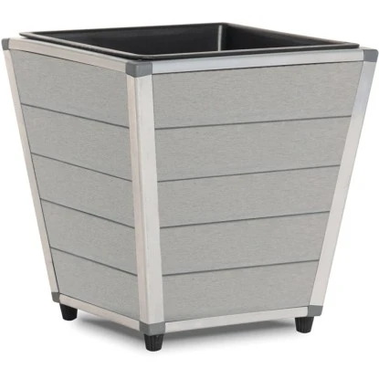 Der Pflanzkasten ist Hellgrau, konisch zulaufend und mit herausnehmbarem Kunststoffeinsatz. Dieser moderne quadratische Blumenkasten wird in Verbindung mit Ihrer Pflanzidee ein Highlight in Ihrem Haus oder Garten. Das Pflanzgefäß besteht aus einem Verbundstoff von Holz und Kunststoff (WPC) und verfügt über einen wasserdichten Pflanzeinsatz aus Polypropylen. Durch das neutrale Grau und den rostfreien Aluminiumrahmen ist der Pflanztopf zeitlos, modern und nahezu überall platzierbar. Kombinieren Sie diesen schönen Pflanztopf mit andere Größen zu einer ansprechenden Gruppe. Somit haben Sie einen stabilen Behälter für Pflanzen, der auch optisch lange Zeit überzeugt.