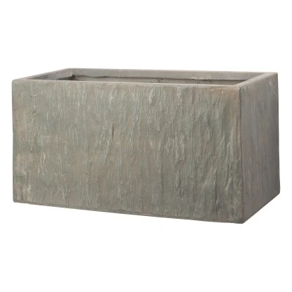 Der aufwendig gestaltete Pflanzkasten aus der Serie Lorient dient zur vielfältigen Bepflanzung auf der Terrasse oder im Garten. Sie können ihn mit großen oder kleinen Grün- oder Blühpflanzen sowie Kräutern bestücken. Er besitzt eine kantige Form und begeistert mit einer mattgrauen, grob strukturierten Oberfläche, die an versteinerte Baumrinde erinnert. Damit stellt Ihnen das Gefäß eine trendige Optik in urwüchsiger Gestaltung zur Verfügung. Seine massive Anmutung täuscht, denn der Blumenkasten ist aus Fibreclay gefertigt. Der stabile und robuste Kunststein ist aus einem Gemisch aus Sand und gebrochenen Steinen hergestellt und damit wesentlich leichter als echter Stein.