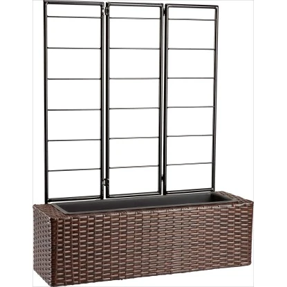 Der Pflanzkasten in der Farbe Braun mit der integrierten Rankhilfe überzeugt durch seine praktischen Eigenschaften und dem edlem Design. Der herausnehmbare Pflanzeinsatz erleichtert Ihnen die Bepflanzung der Pflanzkästen. Das wasserfeste Polyrattan verleiht dem Blumenkasten darüber hinaus eine hochwertige Optik. Er passt sehr gut zu Polyrattan-Gartenmöbeln.