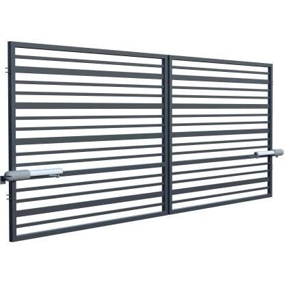 Das Polargos Doppeltor Rubin mit elektrischem Antrieb besteht aus horizontalen Streben und einem Rahmen. Es eignet sich dank seiner geraden Linienführung sowohl für klassische als auch für moderne Gebäude. Es ist ein System von geschweißten Stahlprofilen. Das Paket beinhaltet Antrieb, 4 x Scharniere und Montagezubehör. Sie müssen 2 x Pfosten mit Nietmuttern und oder 4 x Maueranker kaufen.