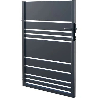 Das Polargos Gartentor Lavender mit Zubehör besteht aus horizontalen Streben und einem Rahmen. Es eignet sich dank seiner geraden Linienführung für moderne Gebäude. Das Paket beinhaltet Klinken, 2 x Scharniere, ein Schloss und Montagezubehör. Sie müssen 1 x Pfosten mit Nietmuttern und 1 x Anschlagpfosten ohne Bohrungen oder 2 x Maueranker kaufen.