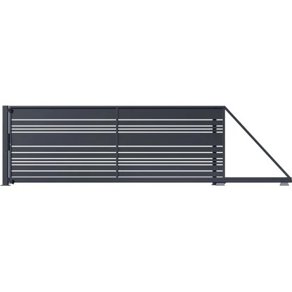Das Polargos Schiebetor Lavender mit Gegengewicht und Zubehör besteht aus horizontalen Streben und einem Rahmen. Es eignet sich dank seiner geraden Linienführung für moderne Gebäude. Es ist ein System von geschweißten Stahlprofilen. Das Paket beinhaltet Hakenschloss, Endpfosten, Führungspfosten und Montagezubehör.