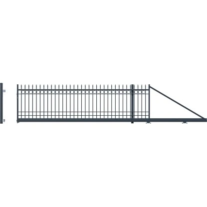Das Polargos Schiebetor Oxford mit Gegengewicht und Zubehör besteht aus vertikalen Streben und einem Rahmen. Es eignet sich dank seiner geraden Linienführung für klassische Gebäude. Es ist ein System von geschweißten Stahlprofilen. Das Paket beinhaltet Hakenschloss, Endpfosten, Führungspfosten und Montagezubehör.