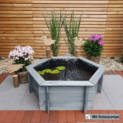Der dekorative Hochteich von Promadino wird aus massivem Kiefernholz gefertigt und ist wetterfest imprägniert. Zum Lieferumfang gehört eine Teichfolie und eine hochwertige Solarteichpumpe.