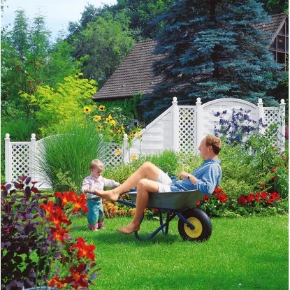 Das blickdichtes Anschlusselement Longlife Romo vereint pflegeleichtes Material mit traditionellem Zaun-Design. Drei Systemhöhen und über 30 Zaunelemente bieten eine große Gestaltungsvielfalt.