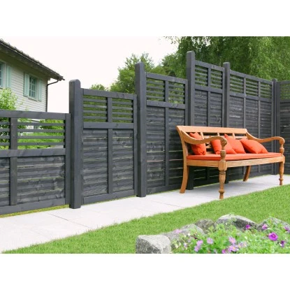 Die Sichtschutzzaun-Serie Limone im Farbton Anthrazit lasiert ist eine blickdichte Sichtblende in modernem Design. Durch die flächige Anordnung ergibt sich eine jalousieartige Optik. Die Rahmen bestehen aus 39 mm x 68 mm starken gehobelten Rahmenhölzern, die profilierten Lamellen haben eine Deckbreite von 115 mm, die Aufsatzleisten sind 13 mm x 68 mm stark. Das Befestigungsmaterial ist aus Edelstahl.