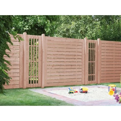 Das Zaunelement Riva hat 2 Gesichter und unterstreicht damit sein modernes Aussehen. Die Sandwichbauweise ist ein Garant für optimalen konstruktiven Holzschutz und dadurch lange haltbar. Die Holzart Douglasie kommt ohne chemischen Holzschutz aus und ist witterungsbeständig. Profile 13 mm x 120 mm glatt gehobelt, Gitterleisten 13 mm x 38 mm glatt gehobelt, V2A gefertigt. Made in Germany.