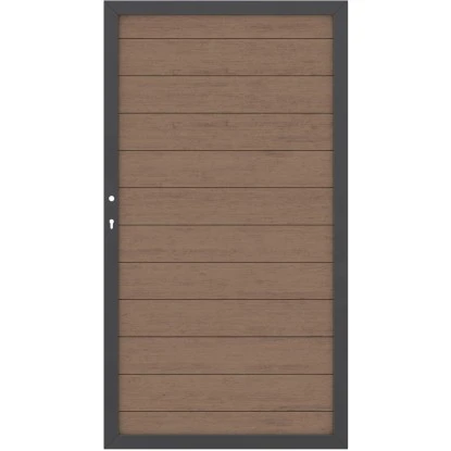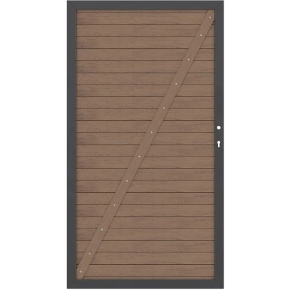 Beim robusten Sichtschutzzaun Tor System WPC sind 12 Profile in dem umlaufenden Metallrahmen fixiert. Zusätzliche Stabilität gewährt die rückseitige Diagonalverstrebung. Der Torrahmen ist mit einer Tiefenbohrung versehen, in dem das Einsteckschloss mit Buntbartzylinder fest eingebaut ist. Verwenden Sie zur Montage die Universal-Torpfosten Anthrazit.
