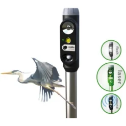 Der Bewegungssensor des Laser Guard von Velda detektiert ankommende Eindringlinge und hat eine Reichweite von ca. 12 m in einem Winkel von 100°. Die Wirkung ist sehr effektiv gegen u.a. Reiher auf drei verschiedene Arten. Blitzlicht mit variablen Frequenzen macht die Umgebung unangenehm unruhig. Reiher betrachten die grünen Laserstrahlen als gefährliche, sich bewegende Hindernisse. Das Geräusch eines Artgenossen in Not, bellende Hunde und die angsteinflößenden Laute eines tödlichen Pfeilgiftfrosches schrecken den Reiher endgültig ab. Diese Abschreckmethode dauert jedes Mal ca. 60 Sekunden, die erschrockenen Eindringlinge werden fliehen, so dass die Fische im Teich wieder sicher sind.
