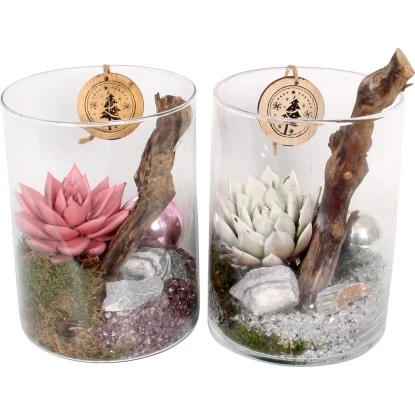 In diesem eleganten Weihnachtsarrangement ist die farbige Echeverie der Mittelpunkt. Zahlreiche Deko-Elemente wie z.B. ein Holzanhänger, eine Weihnachtsbaumkugel und farbschönes Granulat bilden den Rahmen für das Arrangement, das in den Farbtönen Silber und Rosa erhältlich ist.