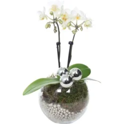 Dieses stilvolle Weihnachtsarrangement mit einer zweitriebigen Mini-Orchidee ist wie gemacht für Liebhaber der tropischen Schönheit, die auch in der Weihnachtszeit die eigenen vier Wände mit Orchideen verschönern möchten. Ob Gold- oder Silbergranulat – hiermit setzen Sie einen dekorativen Akzent und schaffen auf dezente Weise eine weihnachtliche Atmosphäre.