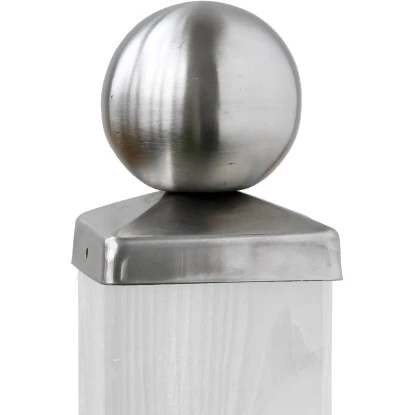 Die Kugel-Pfostenkappe aus Edelstahl ist dekorativer Abschluss für alle Pfosten mit der Stärke 9 cm x 9 cm. Besonders Holzpfosten bietet sie unerlässlichen Schutz vor eindringender Feuchtigkeit. Befestigt wird die Pfostenkappe durch die kleinen Vorbohrungen mit Edelstahlschrauben oder -stiften direkt am Pfosten.