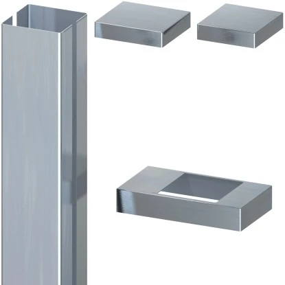 Das Ummantelungs-Set für die System Pfosten ist einen edle Pfostenverkleidung für die Eckpfosten. Sie sind aus Edelstahl und bestehen aus 2 U-Profilen, Kappen und Trägerabdeckungen.